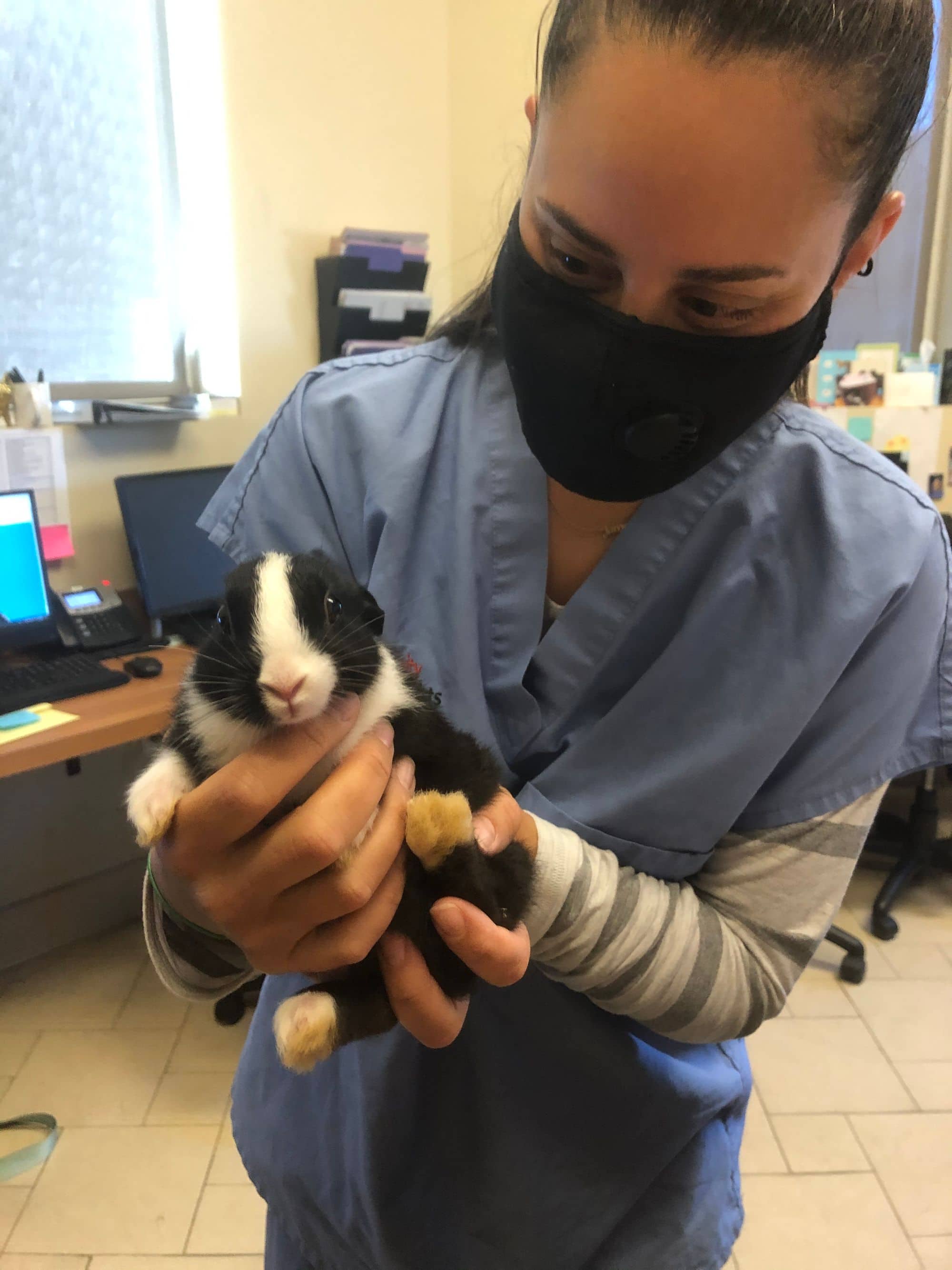 My bunny is named Panda Man, and we adopted him in 2020. He is black and white and gets along well with Haley and Meems.